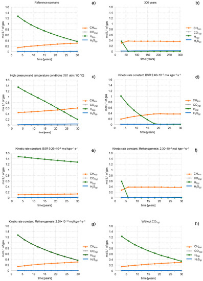 Changes in gas composition in the reservoir rock with ongoing time in (a) reference scenario and influenced by (b) increased storage time of 300 years, (c) higher pressure and temperature conditions, (d) higher kinetic rate constant for BSR of 2.40 × 10−7 mol kgw−1 s−1, (e) lower kinetic rate constant for BSR of 9.26 × 10−9 mol kgw−1 s−1, (f) higher kinetic rate constant for methanogenesis of 2.30 × 10−6 mol kgw−1 s−1, (g) lower kinetic rate constant for methanogenesis of 2.30 × 10−12 mol kgw−1 s−1, (h) varied stored gas composition (without CO2(g)).