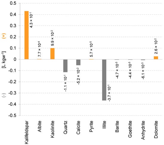 Volume changes of mineral phases (L kgw−1) in the reservoir rock after 30 years of hydrogen storage (reference scenario).