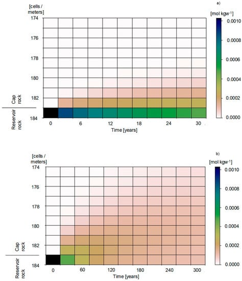 By assuming specific diffusion coefficients for the different aqueous species, the diffusion of hydrogen and related products is modeled. A non-reactive tracer, with the same diffusion coefficient as hydrogen of 5.13 × 10−9 m2 s−1, shows that significant amounts of hydrogen (greater than 4.0 × 10−7 mol kgw−1) were calculated only for distances less than 4 m through the cap rock (in the z-direction) over 30 years, assuming an initial cap rock porosity of 5%, no faults, and non-reactive hydrogen (Figure 4a). However, hydrogen reacts with the mineralogical assemblage of the reservoir rock and brine and is converted by BSR and methanogenesis. The loss of aqueous hydrogen by diffusion is minor. Dissolved hydrogen and corresponding aqueous species concentrations (OH−, CH4, HCO3−, Al(OH)4−, CaOH+, CaHCO3+, MgOH+, MgHCO3+, H2, NH4+, NH3, H2S, HS−, H4SiO4, and H3SiO4−) in the cap rock brine show no significant changes. The most significant difference has been calculated for the NH4+ concentration, which rises to around 4 × 10−4 mol kgw−1 in the first meter of the cap rock (cell 182). Therefore, the effect of hydrogen storage on the cap rock is only visible in the first meter of the cap rock, which is in contact with the reservoir rock (cell 182), after 30 years. Even though each aqueous species migrates with a different rate along its concentration gradient, as described by Buzek et al. [58], the difference in migration is too small to see deviations in the model over the modeled time of 30 years. The loss of the non-reactive hydrogen tracer by diffusion into the cap rock is 25% and represents the maximal loss of aqueous hydrogen by diffusion over 30 years.