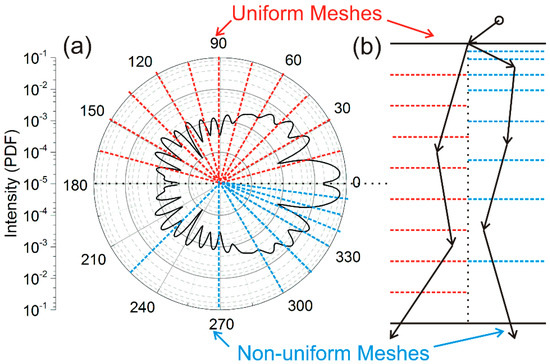 In this study, various discretization schemes are utilized to analyze the effect of discretization. The schematic shown in Figure 1 depicts the comparison of uniform discretization (as in [21,22]) and non-uniform discretization which are proposed by this work. The upper half of Panel (a) represents the uniform discretization and the lower half shows the non-uniform discretization, and in both schemes, 180 intervals were created. For uniform discretizations, every internal is equally divided by a one-degree resolution. For non-uniform discretizations, different discretization schemes are tested, for example, finer meshes/intervals adopted for forward directions (α~0°) and coarse meshes/intervals for backward directions (α~180°). Panel (a) of Figure 1 is a polar plot demonstration of a Mie scattering phase function with a resolution of 1 degree. In this work, this specific phase function shown in Panel (a) of Figure 1 is defined as phase function 1 in this manuscript. For phase function 1, a uniform particle diameter of 1.2 μm, incident light wavelength of 532 nm, and ambient refractive index of 1.0 were selected. The refractive index of the particle was set to be 1.33 and unpolarized light was assumed. Different thickness discretization schemes are shown in Panel (b) of Figure 1. The left-hand side of Panel (b) depicts a uniform discretization in which each layer has the same thickness Δz. Correspondingly, the right-hand side of Panel (b) shows a non-uniform discretization for which the thickness Δz in each layer may vary. The authors believe that different emphasis should be given for different cases. For example, finer meshes near the incident plane of the turbid are desired if the reflected angular distribution is sought. However, the relevance of such discretization is subject to debate for transmitted photon angular distributions, which the authors will also investigate in this work.