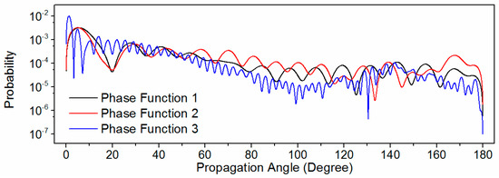 Two additional phase functions were considered in this work and the three phase functions are depicted in Figure 2 in Cartesian coordinates. Phase function 2 is defined based on a particle refractive index of 1.57, and everything else is the same as phase function 1. To create a more structurally complex phase function, phase function 3 is defined based on a uniform particle diameter of 10.0 μm, incident light wavelength of 650 nm, a particle refractive index of 1.57, and an ambient refractive index of 1.0. The phase functions are depicted in Figure 2 and the anisotropy of phase function 1, 2, and 3 are determined to be 0.8314, 0.6653, and 0.8691, respectively.