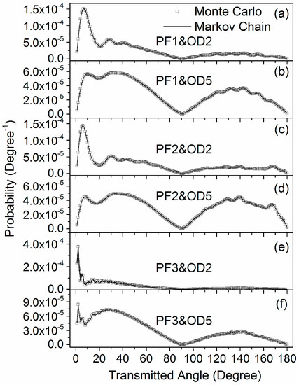 Furthermore, Equation (4) requires numerical integration instead of analytical solutions. To the authors’ knowledge, a general analytical solution for any given phase function of Equation (4) is not readily available for analytical investigation purposes. Therefore, in the Markov chain calculations, φ is discretized (i.e., into 900 equal intervals at a resolution of 0.2°) to numerically solve for P (θi, θj, n).