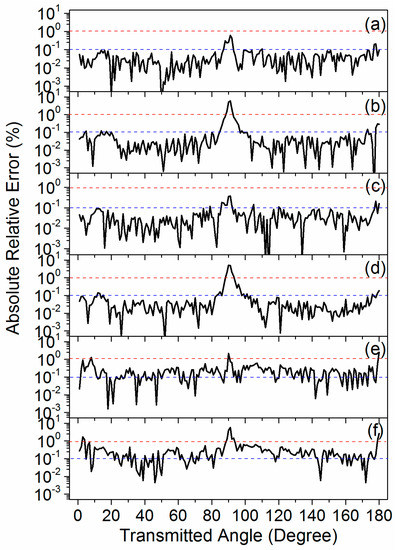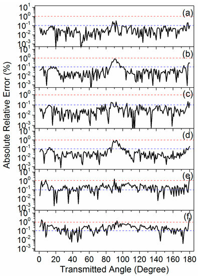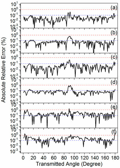 Figure 13 depicts the absolute relative error obtained with the modified Markov inversion process. Uniform zenith angle discretization was used and the OD discretization scheme 1 was chosen. As such, the conditions in Figure 13 are the same as Figure 5, except for where Markov inversion process was chosen. As can be seen in all six cases, from Panel (a) to Panel (f), the absolute relative error with the modified Markov inversion process was at the same level as the original Markov inversion with a higher computational cost, therefore verifying the application of the modified Markov inversion process, as well as the recommended value of 10−4 as the stopping criterion. Note that this recommended stopping criterion is subject to change depending on the desired accuracy, and the program can be stopped even earlier if high accuracy is not required. Furthermore, with the modified method, transmitted angular distribution at each scattering order can also be derived without additional computational costs, thus this method is more efficient than directly performing matrix inversions in solving multiple scattering problems.