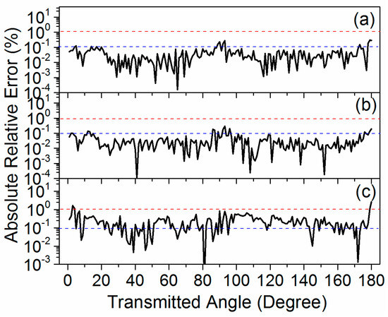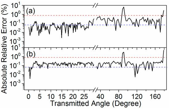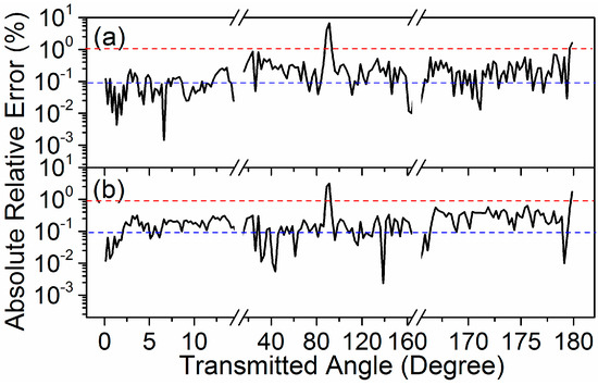 The absolute relative error as a function of the transmitted angle is plotted in logarithm scale in Figure 4. We used Red dash lines to indicate an error threshold of 1.0%, and blue dash lines for a threshold of 0.1%. It is worth noting that we did not use the arbitrarily chosen thresholds to define any regime, but rather to evaluate the performance of each discretization scheme as a reference. From the data, several observations could be made. Firstly, the absolute relative error for all the cases was generally quite small (mostly below 0.1% for phase function 1 and phase function 2, below 1% for phase function 3). The significant error from the phase function 3 case implied that a more complex phase function would significantly increase the error during calculations. Furthermore, the maximum error would increase with a higher OD. More specifically, when the OD increased from 2 to 5, the maximum error (occurring around the transmission angle of 90°) increased from 0.6% to 6.0% in this investigation.