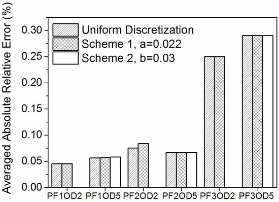 Upon closer examination, it could be readily observed that with the optimal value of either a or b, the relative error was minimized when the OD in the first layer and last layer was close to 0.022 (b = 0.03 yields an OD close to 0.022 in the first and last layer). For example, changing the OD in these layers to 0.022 reduced the error from 6% to 0.8%, and adopting an exponential scheme further reduced the error from 0.8% to 0.3%. Further decreasing the OD in the two layers would increase the maximum error. Scheme 2 did not work for OD = 2 cases because in Scheme 2, the OD in the first and the last layer would always be less than 0.02, and therefore, the optimal value of 0.022 could not be reached. Other cases with higher OD, such as OD = 10 and OD = 15, were also examined and similar observations were made. The authors admit that the rationale behind this optimal value of OD = 0.022 for the first layer and the last layer is not fully understood as yet, although the importance of the first and last layer has been shown. Further analytical investigations regarding this optimal value/scheme will be incorporated in future works.