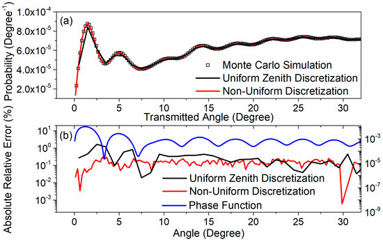 Figure 9 closely examines the performance of zenith angle discretization scheme 2 in the range from 0° to 30°. In this comparison, phase function 3 was selected and OD = 5 for Figure 9. Panel (a) of Figure 9 shows the transmitted angular distribution predictions for both uniform zenith angle distribution (scheme 1) and non-uniform zenith angle distribution (scheme 2). As seen, a uniform angular distribution is not sufficient to resolve the fine structure of the angular distribution predicted by the Monte Carlo simulation (which is more obvious near 3°). In comparison, non-uniform scheme 2 successfully resolved the profile of the transmitted angular distribution. Panel (b) of Figure 9 plots the absolute relative error together with the phase function 3. It is evident that for angular discretization scheme 1, the profile of the absolute relative error resembled the profile of the phase function, indicating that the error was mainly caused by insufficient resolution with regards to the phase function. In contrast, the error curve from angular distribution discretization 2 eliminated such similarities, indicating that the error caused by angular discretization was less apparent.