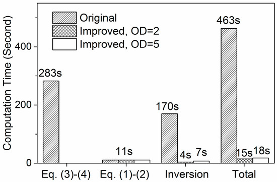 Figure 11 shows the computational cost breakdown for solving for the angular distribution, with and without the iterative approach. Simulations with various OD were performed and the Phase Function 2 was selected. As can be seen in Figure 11, when utilizing the iteration process, the computational cost for the inversion process is reduced from 147 s to 4 s (OD = 2) or 7 s (OD = 5). By incorporating this approach with the pre-calculated phase function P(θi, θj, n), the total computational cost for executing Markov chain approximations can be reduced from 463 s to 15 s (for OD = 2) and 18 s (for OD = 5).