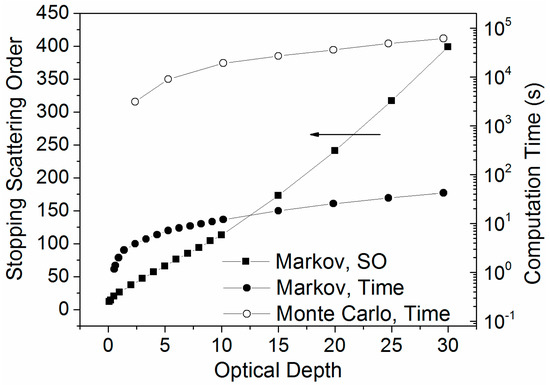 Figure 12 examines the stopping scattering order (SO) and Markov Chan computational costs as compared to the Monte Carlo simulations. The same CPU was utilized for Markov chain approximation and Monte Carlo simulations and 2.5 billion photons were sent in each case. Since MATLAB matrix manipulations involve parallel computing, the computational cost of the Monte Carlo simulation was scaled accordingly. From Figure 11, it is evident that with a higher OD, the computational cost of the modified Markov chain method was also higher because the stopping scattering order t was also higher. The stopping scattering order was roughly equal to the OD multiplied by 12, representing a quasi-linear relationship. The computational time for the modified Markov inversion process ranged from 4 s for OD = 2 cases to 41 s for OD = 30 cases, which was fast enough even when global optimization algorithms were utilized. In comparison, the Monte Carlo simulation cost 3000 s for OD = 2 cases and 61,000 s for OD = 30 cases, and such computational costs would inevitably discourage any meaningful inversion process. It is worth noting that varying the discretization could slightly change the stopping scattering order, but the relative difference was within 10% as the authors examined. Therefore, it was established that the computational cost estimation in Figure 12 is valid for various discretization schemes.