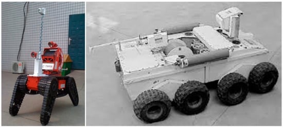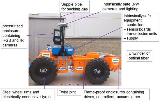 An example of a mobile robot that is designed for usage in coal mines is the Mine Rescue Robot (MINBOT) []. Its second generation—MINBOT-II—is developed based on the experiences learnt from the applications and experiments of the first generation (MINBOT-I) shown in Figure 1. The robot is controlled remotely by the operator via optical fibre. Unlike the previous version, MINBOT-II has its own power supply. The most interesting information—compliance with explosion safety regulations—is not mentioned.