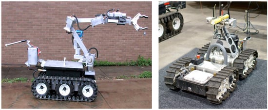 Another example of a mobile robot for underground mines is Wolverine, as developed by Remotec (Oak Ridge, TN, USA)—Figure 2. Originally a military robot, which used to serve as a traditional bomb squad robot, has been made mine permissible []. It weighs over 550 kg and it is driven by explosion-proof motors and rubber tracks. It is equipped with navigation and surveillance cameras, lighting, atmospheric detectors, night vision capability, two-way voice communication, and a manipulator arm. The robot is operated remotely from a safe location and has the capability of exploring up to 1.5 km, communicating vital information about the conditions in the mine over a fibre optic cable. The operator can see real-time information, including video and concentrations of combustible and toxic gasses.