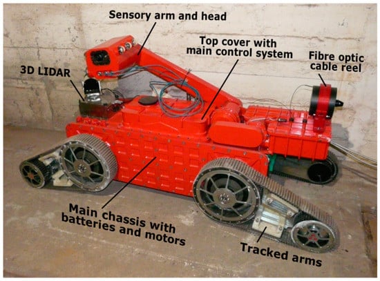 The TeleRescuer robot (Figure 4) consists of the main chassis with four independent tracked arms (eight motors, gears, motor controllers, batteries, and the main control system are placed in a flameproof housing), a sensory arm with a sensory head, a 3D laser scanner unit, and a mote deploying subsystem (motes are small Wi-Fi repeater modules) [,]. Every subsystem has its own independent power supply.