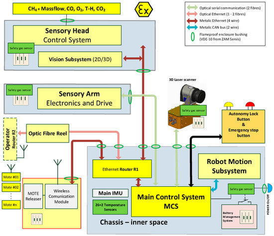 For increased safety, the mobile robot is divided into several galvanic isolated parts (depicted as grey boxes in Figure 6). Each of these subsystems has its own batteries and a safety methane detector (described in further chapters). The subsystems communicate over the optic fibre serial line (RS232) or Ethernet with galvanic isolated transformers.