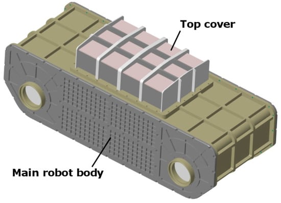 The requirements resulting from the standards place big demands on the design of the covers of the individual components of the robot. The most important is the encapsulation of the robot body, which houses eight robot motors, a battery subsystem, and the main control system. The design requirements are based on standard EN 60079-1—Explosive atmospheres—Part 1: Equipment protection by flameproof enclosure “d” [], which specifies requirements for wall thickness, strength and resistance to the potential explosion of methane within the robot, contact surfaces of detachable parts, etc.