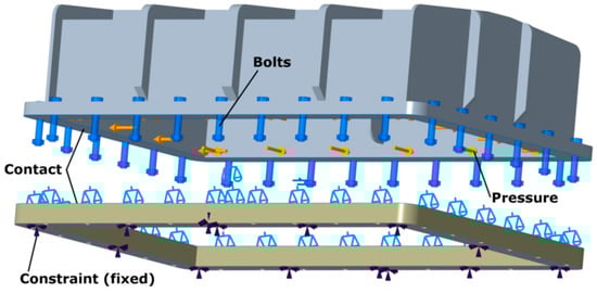 In order to verify and optimize the top cover, it was necessary to create a computational model. The model contains a simplified assembly of the frame and the cover, with a contact between them. The frame is fixed and the cover is connected by screws, which are simulated as idealized Fastener elements (Figure 8). Based on the specification, the material “Stainless Steel 1.4462” was used for calculations (tensile strength Rm = 950 MPa, proof stress Re = 500 MPa).