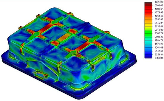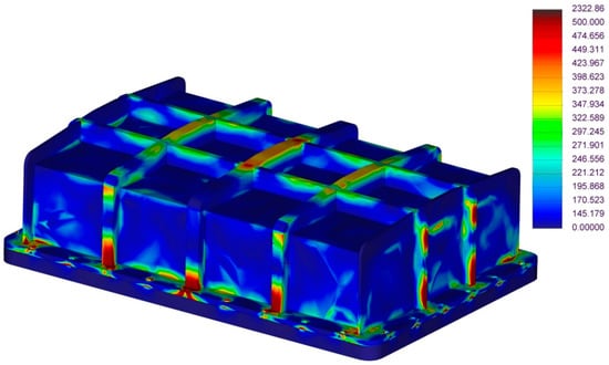 A pressure of 3 MPa was applied on the inner surfaces of the cover. This value simulates the explosion of methane inside the robot body and it is based on experiments from [,], increased by a safety factor. Results of the analysis are shown in the following figures.
