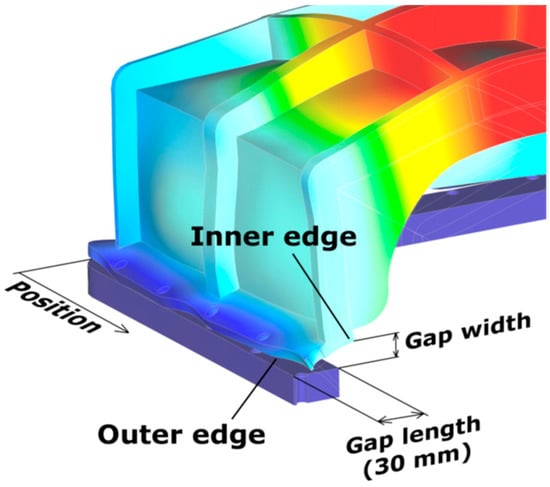 The simulation results show that the contact surface between the top cover and the bottom frame deforms during the explosion and a gap appears. The width of this gap is different on the inner and outer edge of the cover and changes with the position along the edge (Figure 11 and Figure 12), but it never exceeds the allowed limit (the maximum is 0.474 mm, which is less than 0.5 mm).