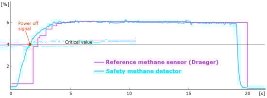 The methane detector was tested in atmosphere that contained methane and other gases in well-known amounts in a special gas chamber. A calibrated gas sensor Draeger X-am 5000 (reference) and the methane detector were closed inside the chamber with gas entry for methane mixture and a small hole for cable harness and to allow a small airflow. Figure 14 shows one of the graphs that were obtained during the testing after calibration, where the measured values closely match values from the reference sensor.