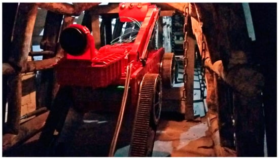 A completely functional prototype of the reconnaissance mobile robotic system TeleRescuer has been built and thoroughly tested in various simulated and real conditions, including a training coal mine Queen Luiza in Zabrze, Poland—Figure 15. Tested were driving abilities (on various terrain material and quality, over obstacles of various sizes and shapes—perpendicular and at an angle, slalom, incline surfaces etc.), power abilities (pulling/pushing an obstacle), sensors accuracy, cameras placement, and image quality, etc. The tests showed some minor problems that should be improved in the following versions of the robot, for example, insufficient traction between the tracks and the ground, and complicated maneuverability in tight spaces during remote control based only on camera images. A detailed report from the tests is available in [].
