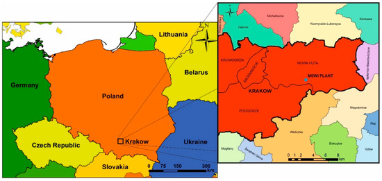 A study area was adopted with the dimensions of 26 km × 26 km, covering almost the entire city of Krakow, with the emitters of the MSWI Plant located in the middle of this area (Figure 1). Krakow is one of the most urbanized areas in Poland (760,000 inhabitants), and the adopted test area is characterized by a particular topography (location of the city in low terrain impeding the undisturbed air flow, relatively high hills surrounding the city from two sides) and a high diversity of land cover classes (Figure 2).