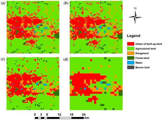 Comparison of the spatial variability of the land cover methods specified for grids of different resolutions: (a) 100 m; (b) 250 m; (c) 500 m; and (d) 1000 m.