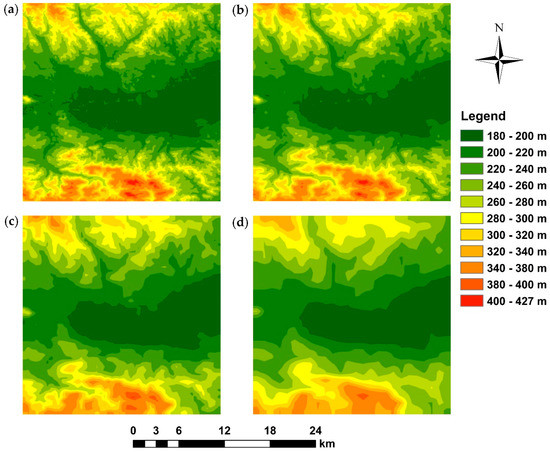 Comparison of elevation maps specified for grids of different resolutions: (a) 100 m; (b) 250 m; (c) 500 m; and (d) 1000 m.