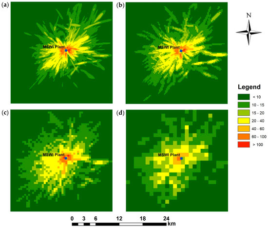 Comparison of spatial distributions of maximum 24-h NO2 concentrations in the air near the land surface (μg/m3), received in the CALMET/CALPUFF modeling system, in the case of the computational grids with the resolution of: (a) 100 m; (b) 250 m; (c) 500 m; and (d) 1000 m.