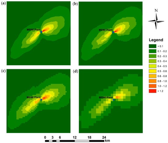 Comparison of spatial distributions of maximum 1-h NO2 concentrations in the air near the land surface (μg/m3), received in the CALMET/CALPUFF modeling system, in the case of the computational grids with the resolution of: (a) 100 m; (b) 250 m; (c) 500 m; and (d) 1000 m.