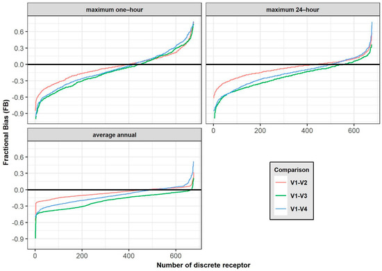 The FB ratio variability for the calculation results of average annual concentrations presented in Figure 7, has similar characteristics to the variability of this ratio obtained for the maximum 24-h concentrations. The average annual concentrations received for Variants V2, V3 and V4 are characterized mainly by overestimation as compared to Variant V1. The most distinctive is Case V1–V3, in which 98% of the analyzed receptors showed overestimation of the calculation results. On the other hand, the range of |FB| < 0.3 in Case V1–V2, includes as much as 99% of calculation receptors. The results obtained for the average annual concentrations have smaller deviation with respect to the reference value, as compared to other averaging periods. It is also worth mentioning that twofold overestimation of the concentrations results was not recorded, and only one receptor in the case of V1–V4 showed at least a twofold underestimation.