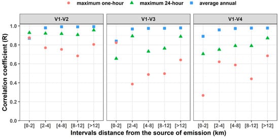 Spatial differentiation of the correlation coefficients between the analyzed cases obtained for distinct types of the NO2 air concentrations in the discrete receptors grouped depending on the distance from the emission source.