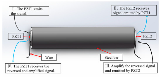 The time reversal (TR) method enabled by the piezoceramic transducer is a relative new approach, and has found use in some applications, including therapy, electromagnetic, SHM, underwater acoustics, and ultrasound medical imaging. For guided waves in cylinders, the propagation of the stress waves is complex, and numerous vibrating modes propagate simultaneously at one single excitation frequency [32]. For steel bars, the propagation of the guided waves in them will be more complex, and non-uniform distributed points or pits on the bar surface as a result of the corrosion can cause serve noise. As an inherent property, the time-reversal method has the capability of self-adaptive focusing and robust anti-noise [67], which can make up for the limitation of multi-path transmission [68], enhance the received pulse energy [69,70], and improve the detection capability. Fink [71] applied the TR methods to the acoustic field, and carried out an in-depth research on the theory, experiment, and application of the adaptive focusing principle. The TR method has the above advantages, and has been applied to steel bar corrosion monitoring in this study. Taking the advantages of having the ability to generate and detect stress waves in a wide frequency range, two PZT disks, which are bonded to the end-surfaces of the steel bar, are used as transducers to enable the TR method, as illustrated in Figure 2.