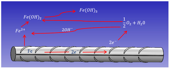 The impressed current technique, also known as the galvanostatic method, was widely used to accelerate the corrosion of the steel bar in the concrete durability tests [72]. The steel bar was connected to the positive electrode of a DC power supply source as the anode, which acted as a reducing agent, and was oxidized under the effect of the electric current and the loss of the ions. The copper rod connected to the negative electrode acted as the cathode, and the combined with generated hydroxyl ions when a reduction reaction occurred in the oxidant. The ions combined with the ions and generated when there were relatively increased oxygen contents in the electrolyte. Conversely, could be oxidized completely when there was a lack of oxygen in the electrolyte, which was changed to black rust as [73]. The chemical process of the steel bar corrosion is shown in Figure 4.