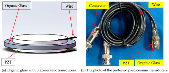 In the steel bar corrosion detection experiments, the piezoceramic transducers and the steel bar were simultaneously immersed in the sodium chloride solution. To ensure that the piezoceramic transducers worked properly without corrosion, it was necessary to experimentally study the property of the piezoceramic transducers in the solution. For this experimental study, two pieces of piezoceramic transducers were bonded on both sides of a piece of organic glass disk by using an ultrasonic vibrator adhesive, as shown in Figure 5a. Then, an epoxy resin was used to wrap them completely, in order to protect the piezoceramic transducers and the connection wires, as shown in Figure 5b.