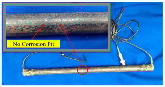 An NaCl solution has been chosen in this study, which is based on the large amount of NaCl in seawater, and because the long-span bridge structure is vulnerable to seawater erosion. Piezoceramic transducers were bonded on the surface of the two ends of the steel bar, and a multimeter was used to detect whether the piezoceramic transducers were properly insulated. First, the Labview data acquisition system was used to carry out a frequency sweep so as to acquire the resonance frequencies of the steel bars and to record the waveform data. The obtained data showed that the amplitude of the received signal had a better response at frequencies ranging between 25 KHz to 100 KHz. The Gaussian pulse signals, whose frequencies were set as 70 KHz, 60 KHz, and 50 KHz, respectively, and with an amplitude of 5 V for all of the frequencies, were generated using a Labview program hosted by a PC. The pulse signals were recorded every 5 h using a Labview program, and the quality of the steel bar during the accelerated corrosion process was measured using the current control technique. Figure 9 and Figure 10 show the steel bar without corrosion and the same bar with corrosion after 35 h, respectively.