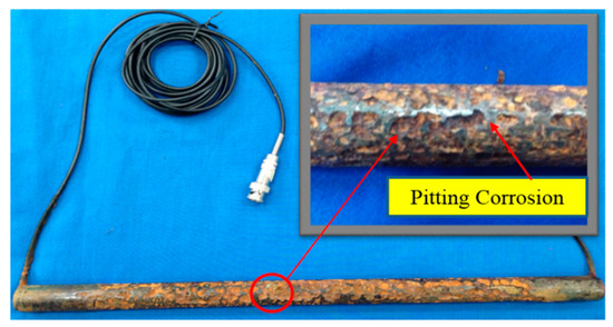 Steel bars are widely used as reinforcements for concrete structures in civil engineering [1,2]. Although the use of non-metal bars in concrete is receiving more and more attention [3,4], steel bars are still the most commonly used in concrete structures. During their service life, steel bars are prone to corrosion in the natural environment [5]. The consequences of the corrosion of steel rebars may result in non-uniform distributed points or pits on the steel surface, and the volumetric expansion of the reactant leads to the increase of radial stress on the reinforcement concrete, which reduces the constraints of the reinforced concrete, destroys the original bonding, and ultimately results in cracks in the structure [6,7]. The corrosion of steel bars often occurs in coastal structures, hydraulic structures, and bridges, as well as roads and buildings, among others. The corrosion of steel bars poses a threat to the safety and health of these structures, and may cause catastrophic consequences if undetected.