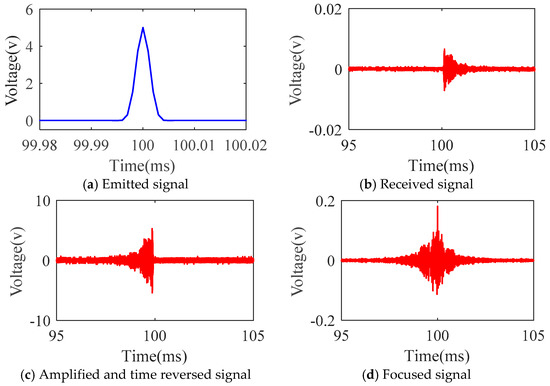 Figure 11 and Figure 12 show the amplitudes of the focused signal after 15 h and 35 h, respectively. During the test, the received time domain signal was reversed using the TR method, and the gain coefficient of the Labview data acquisition program was adjusted to improve the amplitude of the reversed signal. Then, the corresponding focused signal was obtained using the TR method. The non-uniform distributed points or pits on the surface of the steel bar increased with the increase of the corrosion degree, which meant that the wave propagation path was more complicated owing to the rusting of the steel bar surface. The transmission signal oscillated repeatedly in the propagation path and led to an increased dissipation of the wave energy within the steel bar. As a result, the magnitudes of the focused signals were decreased. As shown in Figure 11d and Figure 12d, the peak values of the focused signals show a significant decline at the two different time periods.