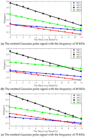 The relationship between the mass loss ratio of the steel bar and the peak values of the focused signal were established, as shown in Figure 13a–c. Four different straight lines with cross, plus, square, and star signs (in Figure 13) express the experimental results of different steel bars (specimens no. 1, 2, 3, and 4, respectively).