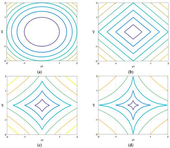 Contour lines of Lp-pseudo-norm: (a) p = 2; (b) p = 1; (c) p = 0.8; (d) p = 0.6.