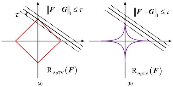 Lp-pseudo-norm contour lines are given in Figure 1, where p = 2 and p = 1 represent L2- and L1-norms, respectively. Assuming that the image is contaminated by impulse noises with an absolute difference of τ, Figure 2 shows the schematic plots of anisotropic total variation contour lines intersecting with the fidelity term. As shown in Figure 2, the intersections of the contour lines with the fidelity term are more sparse for , as shown in Figure 2b, than for , as shown in Figure 2a, therefore the robustness of the model against noise is better.
