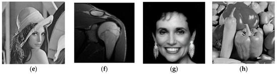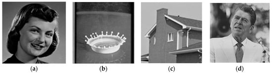 In this section, eight typical grayscale images with a size of pixels are chosen to validate the denoising performance of the Lp-OSG-TV-FAST method. The test images are as shown in Figure 3. The image “House” is downloaded from http://sipi.usc.edu/database/database.php?volume%92=%92misc&image=5top. The images “Lena“ and “Pepper” are from http://decsai.ugr.es/cvg/dbimagenes/. The images “Woman”, “Girl”, and “Reagan” are from http://www.hlevkin.com/default.html#testimages. The images “Milk drop” and “Shoulder” are from http://www.cs.cmu.edu/~cil/v-images.html. The versions of the images in our paper are other special formats which are converted by Photoshop from the sources above.