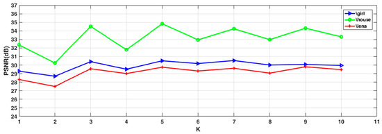 Comparison of peak signal-to-noise ratio (PSNR) under different K values (Noise Level = 30%). The test images (“Girl”, “House”, ”Lena”) are corrupted by 30% impulse noise.