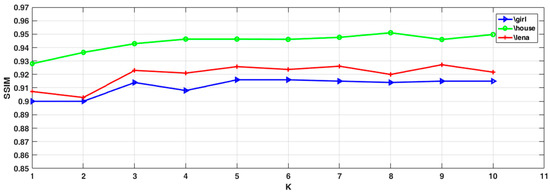 In this section, an important parameter of the proposed algorithm, the group size K, is tested and compared to evaluate its overall effect on the algorithm. PSNR and SSIM are used as criteria to evaluate the algorithm objectively. Three images (“Girl”, “House”, and “Lena”) with 30% noise level are selected, on which K is made to vary continuously from 1 to 10. The other parameters are adjusted to the optimum. PSNR and SSIM values are recorded and plotted into graphs, as shown in Figure 4 and Figure 5. In Figure 4, PSNR and SSIM increase with the increase of K and reach their maximum at K = 5. Further increases in K leads to decreased PSNR values. Thus, the neighborhood information of an image has a positive impact on the performance of the algorithm. With K set to appropriate values, the edge information of the image is better preserved, and the noise resistance is improved. However, K should not be too large either, or nearby regions with drastic pixel changes could be taken, which will result in decreased PSNR and SSIM.