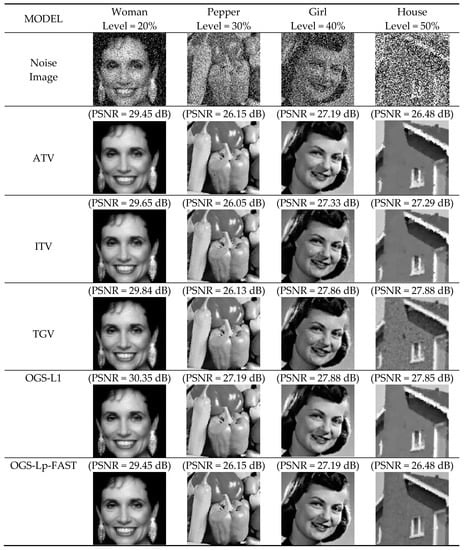 - Comparing the values of PSNR and SSIM in Table 2, Table 3, Table 4 and Table 5, OGS-Lp-FAST and OGS-Lp have the same denoising effect. However, by observing the value of runtime of all testing images, we find that convergence is sped up in the OGS-LP-FAST method with the use of accelerated ADMM with a restart. For example, at a 20% noise level, as shown in Table 2, the time value of the “Woman” image (8.69 s) given by the OGS-Lp-FAST model is 7.53 s less than that given by the OGS-L1 model (16.22 s).