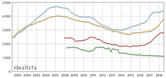 - Idealista. Índice Idealista 50: Evolución del Precio de la Vivienda de Segunda Mano en España. 2018. Available online: https://www.idealista.com/news/estadisticas/indicevivienda#precio (accessed on 20 November 2018).