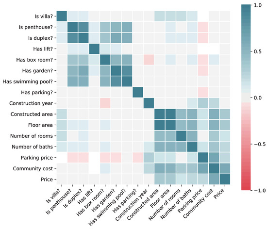 Before proceeding with the training of machine learning models, we are interested in getting some insights about the data at hand. In particular, it would be interesting to know how different variables affect the price of the real estate model, to understand their potential quality as predictors. This information is shown in Figure 4, where the correlation between each pair of variables (considering only binary and continuous variables) is shown. The Pearson correlation coefficient is computed for continuous variables, and the point biserial correlation coefficient is computed for binary variables.