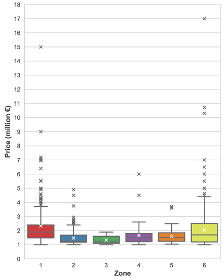 Figure 5 shows the distribution of asset prices based on their location, more specifically, based on their zone attribute provided by Idealista. Although differences are not very noticeable, it can be seen how assets in zone 1 have a substantially larger mean and median price when compared to the other zones. Zones 2 and 3 have slightly lower prices than the rest of the zones.
