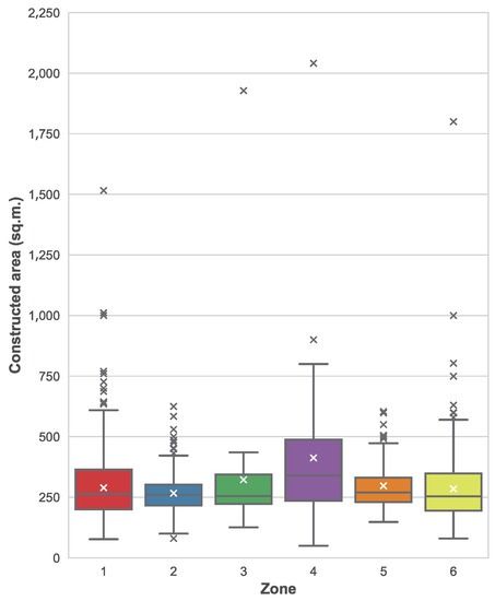 To understand whether these variations can be explained because of the zone and not because of other factors, we have also plotted the distribution of constructed areas per each zone, which can be seen in Figure 6. In this figure, we can see how there are not remarkable differences between different zones, with the exception of zone 4 where the median area is noticeably larger. When comparing the distributions of areas with the distribution of prices, we can conclude that the asset location is also a factor when determining the price, beyond the constructed area itself. For example, it seems that zone 1 is more expensive in average, since prices are larger while areas follow a similar distribution than in other areas. The opposite happens with zone 4, where prices are roughly the same but constructed areas are larger.