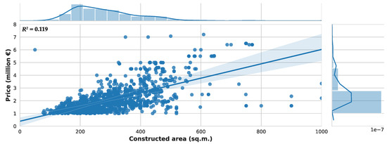 Finally, we are interested in checking how some basic regression models can fit the prices based only on the constructed area. We plot a linear regression model on Figure 7. Assets with prices larger than 8 million have been removed from the figure to ease readability, since these assets are a minority. The coefficient of determination of this linear regression model is .