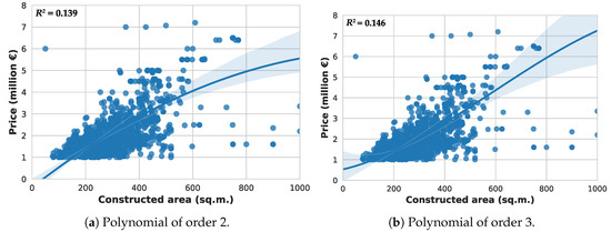 Additionally, we have also fitted two polynomial regression models of order 2 and 3, shown in Figure 8a,b, with respective values of 0.139 and 0.146.