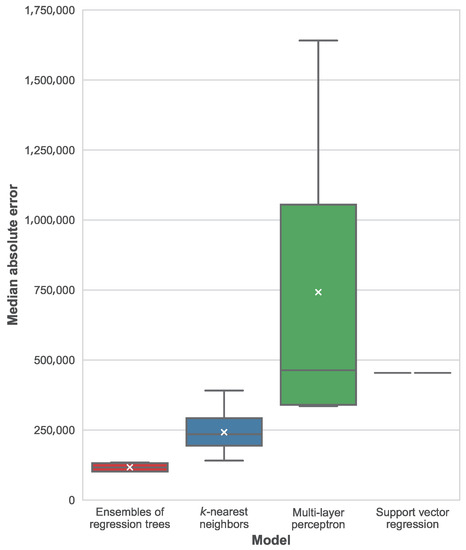 The distribution of best median average errors per machine learning technique is shown in Figure 9. In this figure, we can see how ensembles of regression trees significantly outperform all of the other techniques, followed by k-nearest neighbors, support vector regression and the multi-layer perceptron. In the case of support vector regression, only one configuration was tested and the model is deterministic, for this reason there is a single result instead of a distribution. As for the multi-layer perceptron, a very large variance can be seen in the distribution of results, along with a remarkable difference between the average and the median MedAE. Worst MAE and MedAE are always reported by the multilayer-perceptron with a single layer with 1024 units. Because of the relatively small availability of data, this model could be affected by overfitting, although further testing is required to confirm this diagnosis.