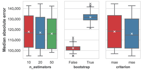 Distribution of the median average error based on the different parameters for the ensembles of regression trees.